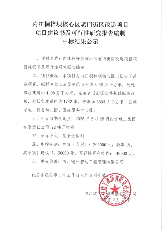 內(nèi)江桐梓壩核心區(qū)老舊街區(qū)改造項目 項目建議書及可行性研究報告編制 中標結(jié)果公示